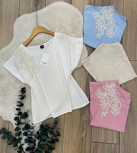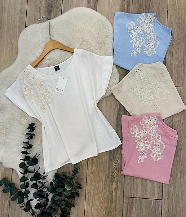 BLUSA LINO MANGA CORTA DETALLE BORDADO - BLANCO, CIELO, ROSA, HUESO - S/M/L/XL