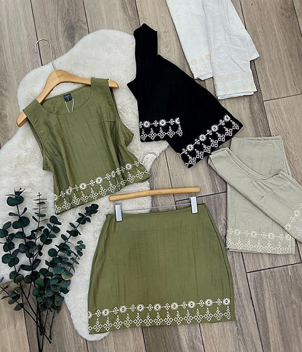 CONJUNTO LINO 2 PIEZAS, BLUSA SIN MANGA Y MINI FALDAS CON DETALLES BORDADOS