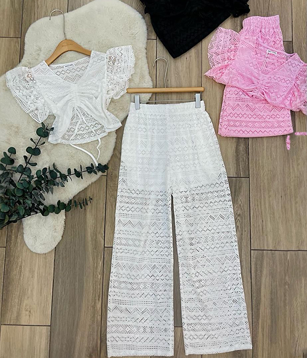 CONJUNTO 2 PIEZAS, BLUSA CROP ENCAJE Y PANTS PALAZO ENCAJE - BLANCO,NEGRO,ROSA - S/M/L