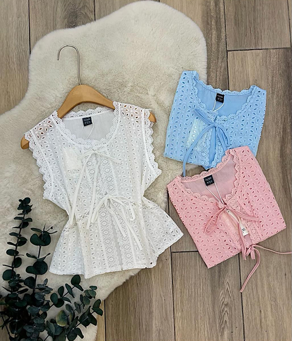 BLUSA ENCAJE SIN MANGA DETALLES CINTILLAS ENFRENTE - BLANCO, CIELO, ROSA - S/M/L